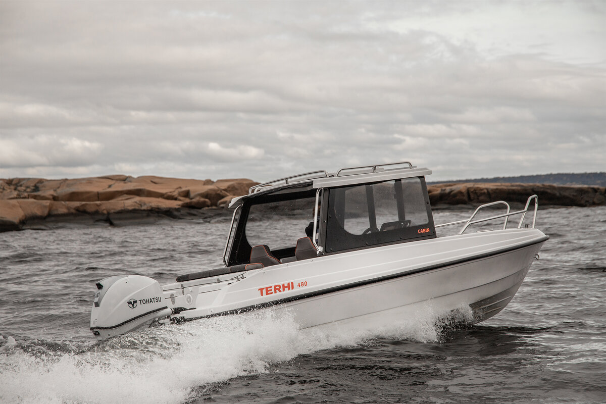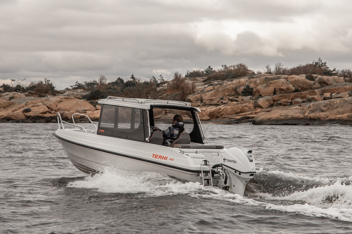 Lansert til 2024 kom denne modellen som skiller seg ut fra resten av båtene i Terhis portefølje på grunn av én bestemt funksjon – kabinen. Nyheten, som går under navnet Terhi 480 Cabin, er i hovedsak en hardtop-versjon av den populære Terhi 480 BR-modellen, som lar fører og passasjer reise beskyttet fra vind og sjøsprøyt i komforten av en kabin.